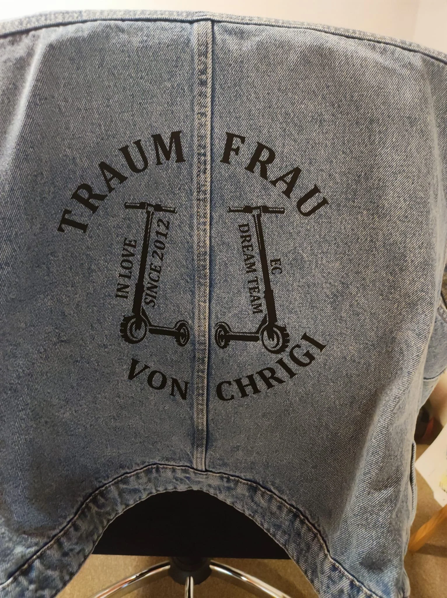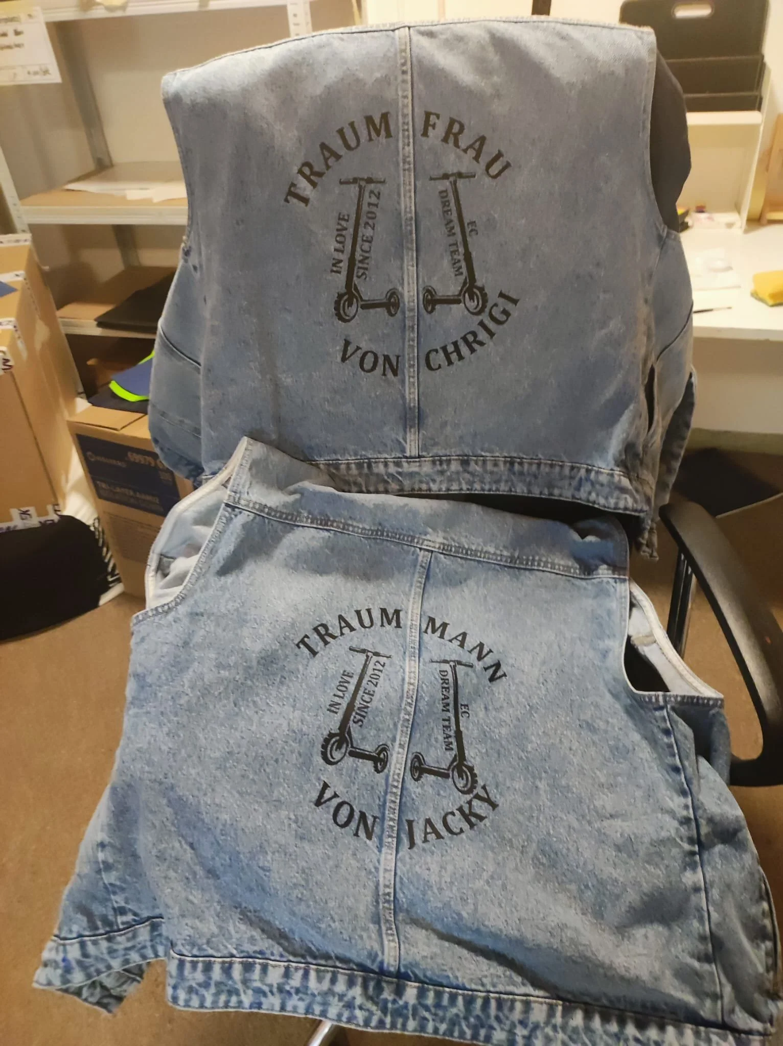 Ein Herzensprojekt für Meine Mutter und ihren partner als Paar – zwei personalisierte Jeanswesten mit humorvollem Design und Symbolik. Ein Ausdruck von Liebe, Zusammenhalt und Kreativität – individuell und mit einem Augenzwinkern gestaltet.